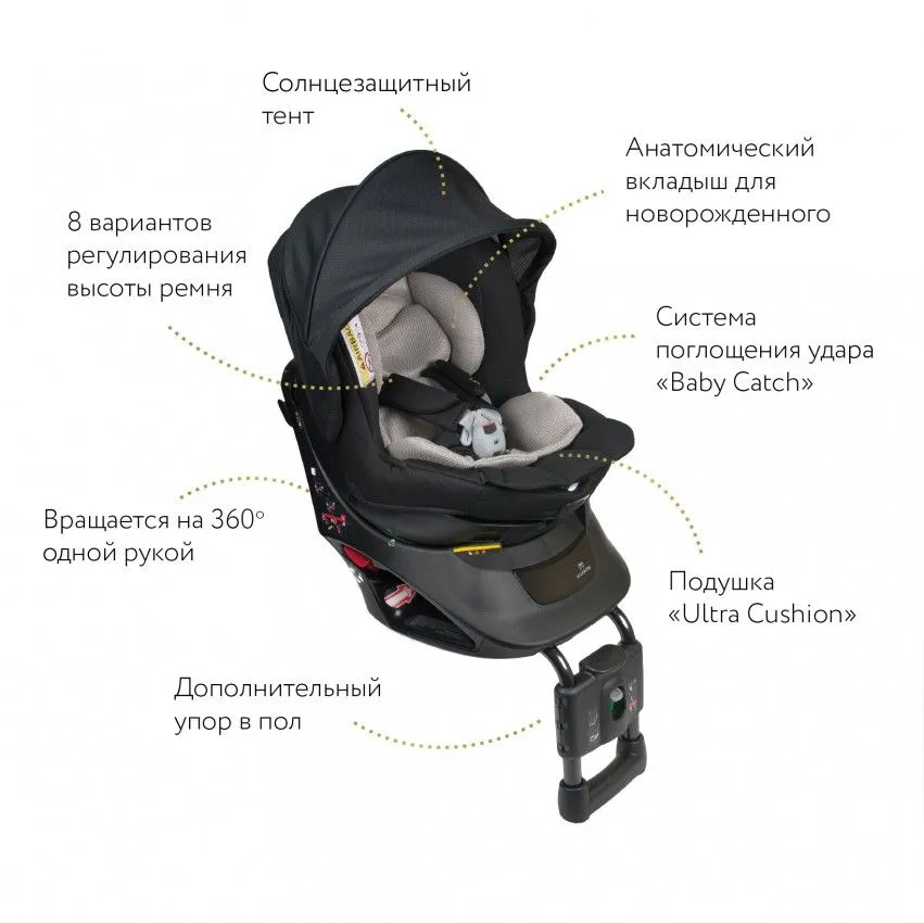 Эта модель разработана с учетом анатомических особенностей строения тела ребенка, что делает её очень удобной. Новый механизм с восемью вариантами положения ремней безопасности позволит быстро подобрать их по росту ребенка. Вкладыш «Мамины руки» позаботится об удобстве головы и ножек малыша, а так же равномерно распределит нагрузку на его тело, оставляя суставы расслабленными. Высокие боковины и глубокая посадка кресла, а так же система поглощения удара «Baby Catсh» и дополнительный упор, предотвращающий опрокидывание, обеспечат дополнительную безопасность во время поездок. Вращающаяся чаша на 360 градусов, которая легко поворачивается одной рукой, и автоматизированная система натяжения ремней сделают удобным процесс усаживания ребенка в кресло, а чехол из износостойкого материала достаточно просто снимается для деликатной стирки.