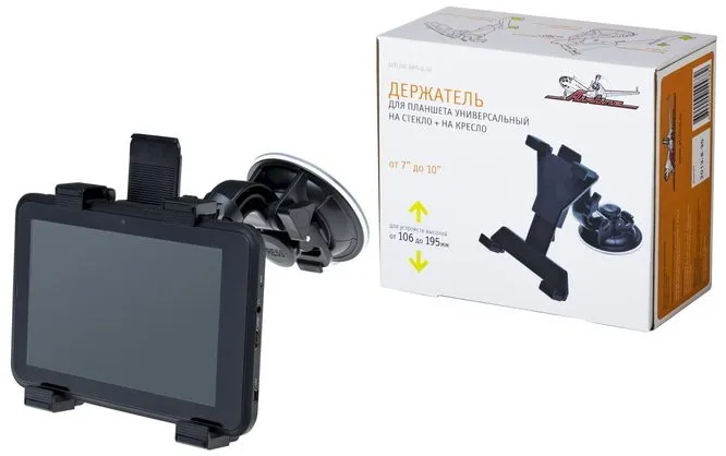 Держатель крепится на поверхность стекла при помощи присоски. Имеет несколько регулировок наклона. Резиновые накладки на прижимах надёжно удерживают устройство от выскальзывания. Размер удерживаемого устройства: 106-195 мм Особенности: для планшетов от 7 до 10 дюймов Дополнительные аксессуары: кронштейн для крепления на подголовник кресла