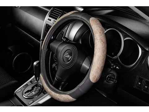 Чехол на руль с тканевыми вставками, на которых изображены цветы, идеально подойдет для автолюбительниц. Качественный материал, имитирующий кожу, прочен и долговечен, а мягкая фактура ткани не только изящно смотрится, но и создает комфорт при вождении. Чехол плотно фиксируется на руле и не прокручивается во время движения.