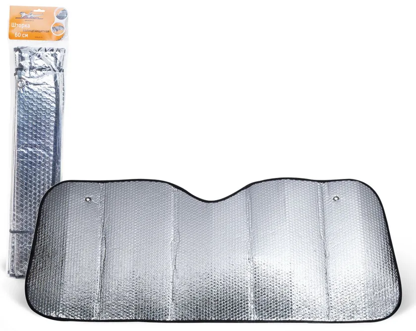 Двусторонняя солнцезащитная шторка размером необходима для блокировки попадания солнечных лучей со стороны лобового стекла в салон машины. Серебристая поверхность шторки отражает солнечные лучи, защищая салон и торпеду автомобиля от нагрева. Крепится к лобовому стеклу с помощью двух присосок. Высота шторки 60 см - идеальна для отечественной классики и автомобилей A и B категории.