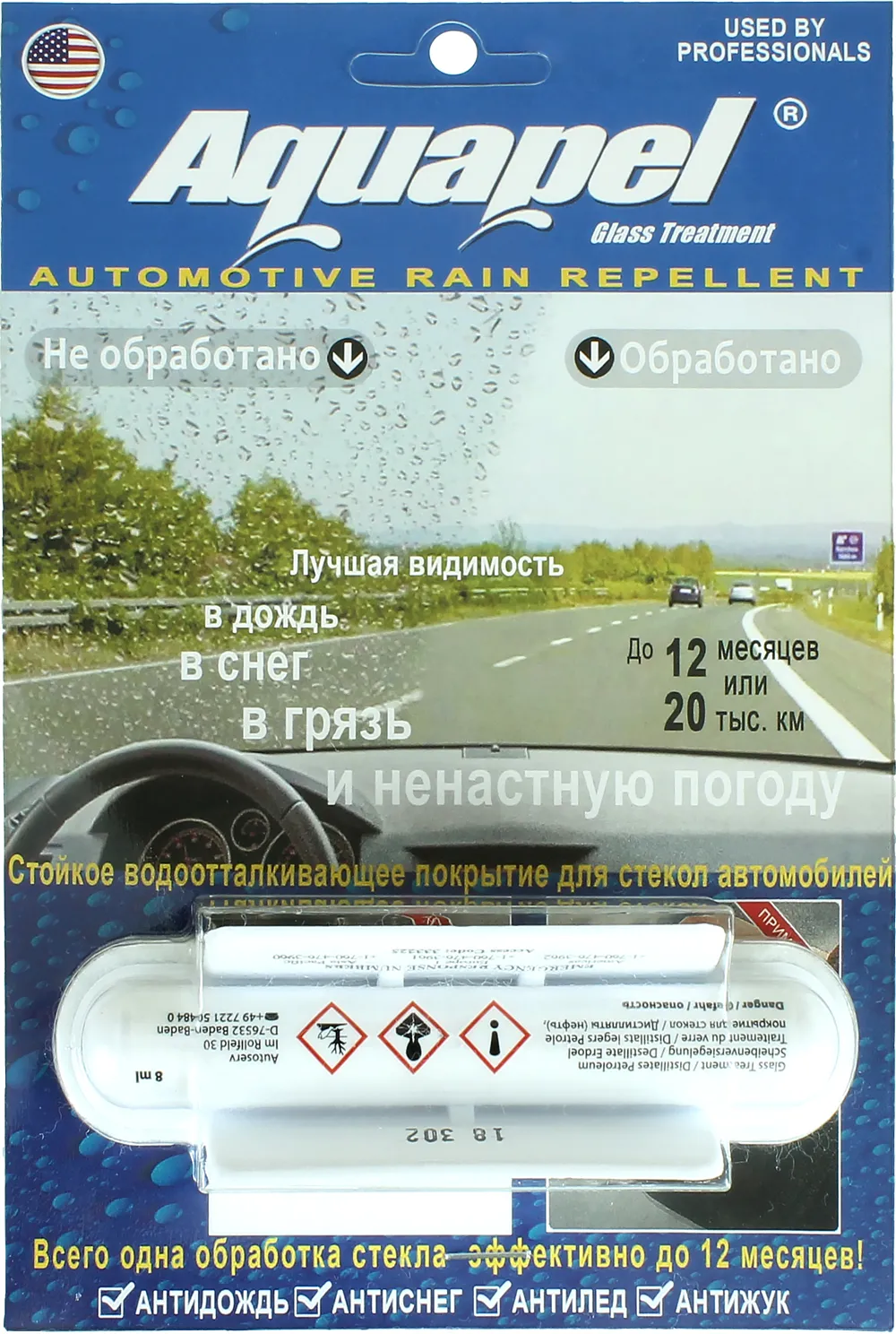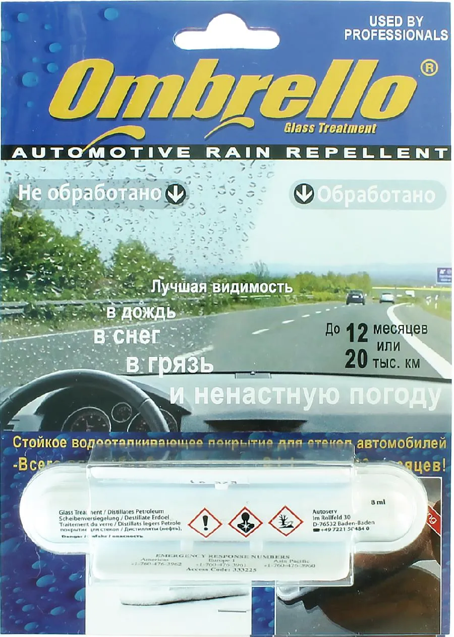 После одноразовой обработки средством от Ombrello лобового и боковых стекол автомобиля, оно сохраняет свое действие до 10 месяцев или 20 000 км пробега, гораздо дольше чем другие средства.