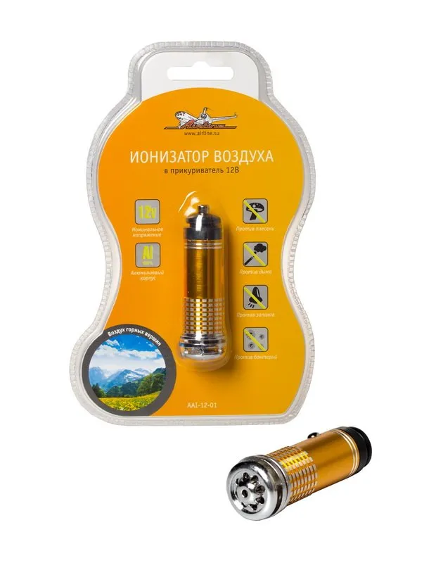 Устройство применяется для очистки и ионизации воздуха в салоне транспортного средства. Устройство работает от розетки прикуривателя 12В. Ионизатор изготовлен в фирменном оранжевом цвете AIRLINE и имеет корпус из алюминия.