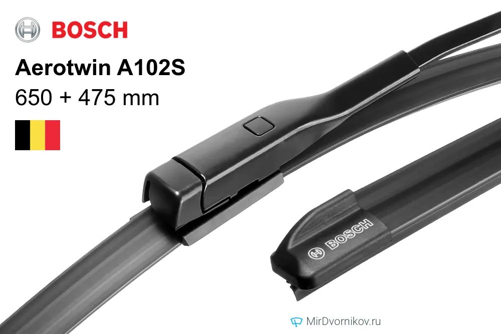Bosch Aerotwin A102S это комплект из 2-х щеток длиной 650мм + 475мм. Стеклоочистители имеют бескаркасную конструкцию.