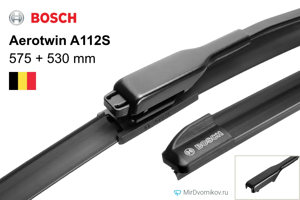 Bosch Aerotwin A112S - набор из двух дворников длиной 575мм и 530мм. Стеклоочистители имеют бескаркасную конструкцию.