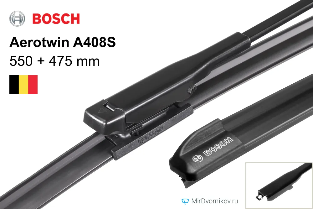 Bosch Aerotwin A408S - набор из 2-х дворников с длинами 550мм + 475мм. Щетки имеют бескаркасную конструкцию.