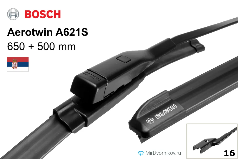 Bosch Aerotwin A621S - это комплект из 2-х бескаркасных щеток с длинами 650мм и 500мм.