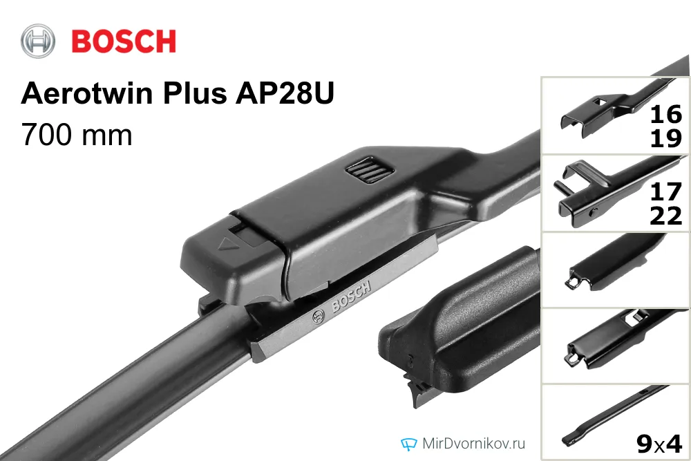 Стеклоочистители Bosch Aerotwin Plus - вариант флагманской серии Bosch Aerotwin, имеющие в комплекте набор из 6 адаптеров для 10 различных типов креплений. В отличии от щёток Bosch Aerotwin с предустановленными специфичными креплениями, они немного сложнее в установке, из-за необходимости установки нужного адаптера. Кроме того, аэродинамические показатели щёток немного ниже, из-за конструкции адаптера и использования универсального симметричного спойлера.