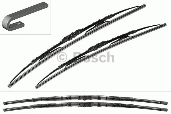 TWIN - серия классических каркасных щеток от компании Bosch. Эти щетки имеют полностью металлический каркас с двойной защитой от коррозии и сверх-точный профиль резинового элемента с двумя чистящими кромками. Стеклоочистители выпускаются как в комплектах по 2 штуки, так и в индивидуальной упаковке. Большинство "дворников" TWIN имеет крепление "крючок", предустановленный на них адаптер Quick-Clip позволяет легко установить щетки на автомобиль.