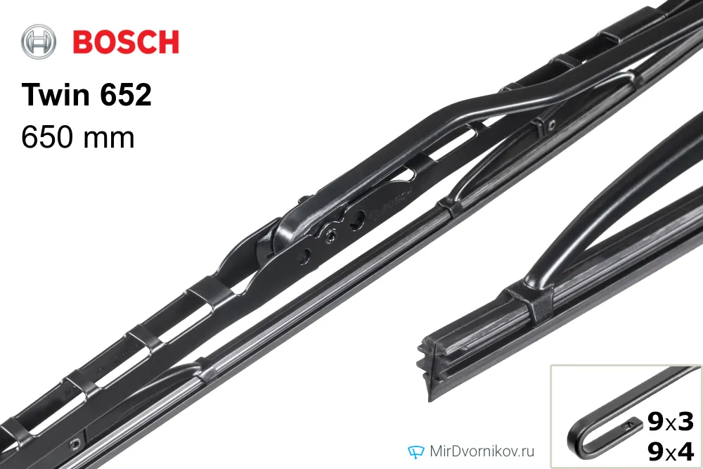 TWIN - серия классических каркасных щеток от компании Bosch. Эти щетки имеют полностью металлический каркас с двойной защитой от коррозии и сверх-точный профиль резинового элемента с двумя чистящими кромками. Стеклоочистители выпускаются как в комплектах по 2 штуки, так и в индивидуальной упаковке. Большинство "дворников" TWIN имеет крепление "крючок", предустановленный на них адаптер Quick-Clip позволяет легко установить щетки на автомобиль.