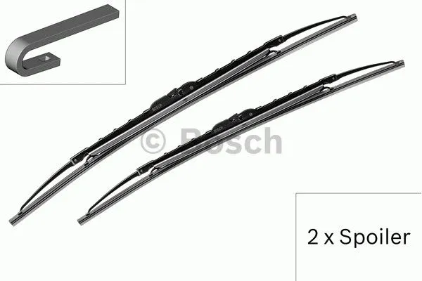 TWIN Spoiler - серия классических каркасных щеток со спойлером от компании Bosch. Эти щетки имеют полностью металлический каркас с двойной защитой от коррозии и сверх-точный профиль резинового элемента с двумя чистящими кромками. Спойлер выполнен в виде металлического "крыла", закрывающего каркас щетки от воздушного потока. Стеклоочистители выпускаются как в комплектах по 2 штуки, так и в индивидуальной упаковке, если щетки поставляются в комплекте, то спойлер имеет только водительская щетка. Большинство "дворников" TWIN Spoiler имеют крепление "крючок", предустановленный на них адаптер Quick-Clip позволяет легко установить щетки на автомобиль.