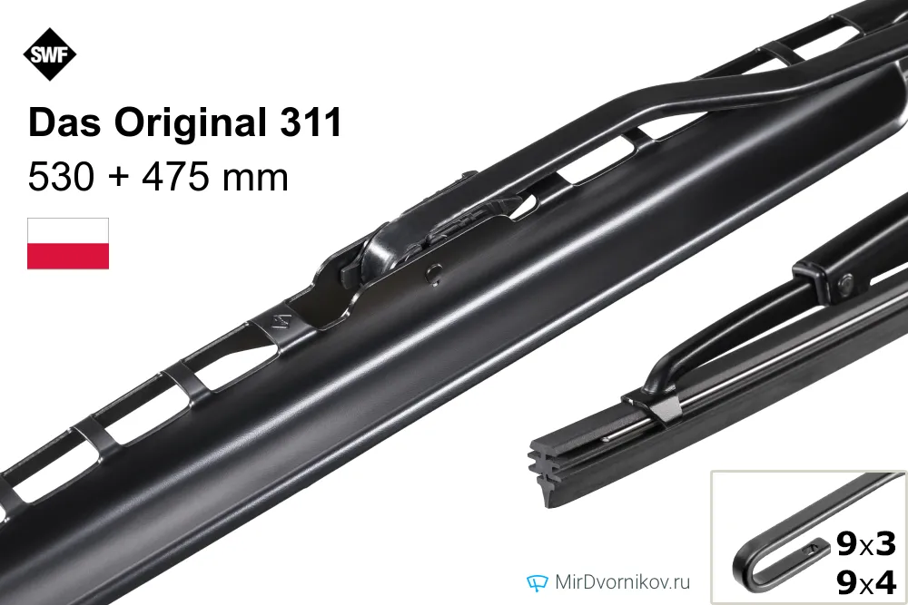 Серия SWF Das Original разработана для максимального покрытия европейского парка автомобилей с каркасными стеклоочистителями. Все щетки Das Original разрабатываются с учётом специфики конкретных автомобилей. Они могут быть оснащены спойлерами, форсунками стеклоомывателя, специфическими креплениями или иметь изогнутую форму для максимального соответствия оригинальным стеклоочистителям. Дворники SWF Das Original имеют полностью металлическую конструкцию и индикатор износа, который сигнализирует об ухудшении свойств резины под воздействием ультрафиолетового излучения солнца.