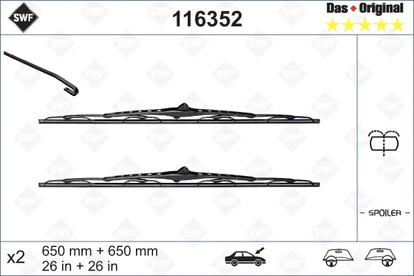 Серия SWF Das Original разработана для максимального покрытия европейского парка автомобилей с каркасными стеклоочистителями. Все щетки Das Original разрабатываются с учётом специфики конкретных автомобилей. Они могут быть оснащены спойлерами, форсунками стеклоомывателя, специфическими креплениями или иметь изогнутую форму для максимального соответствия оригинальным стеклоочистителям. Дворники SWF Das Original имеют полностью металлическую конструкцию и индикатор износа, который сигнализирует об ухудшении свойств резины под воздействием ультрафиолетового излучения солнца.