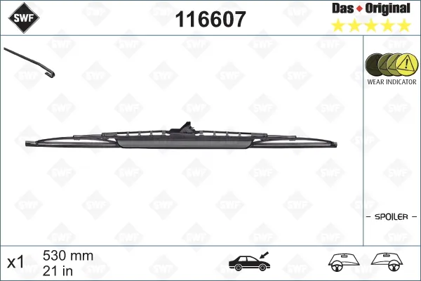 Серия SWF Das Original разработана для максимального покрытия европейского парка автомобилей с каркасными стеклоочистителями. Все щетки Das Original разрабатываются с учётом специфики конкретных автомобилей. Они могут быть оснащены спойлерами, форсунками стеклоомывателя, специфическими креплениями или иметь изогнутую форму для максимального соответствия оригинальным стеклоочистителям. Дворники SWF Das Original имеют полностью металлическую конструкцию и индикатор износа, который сигнализирует об ухудшении свойств резины под воздействием ультрафиолетового излучения солнца.