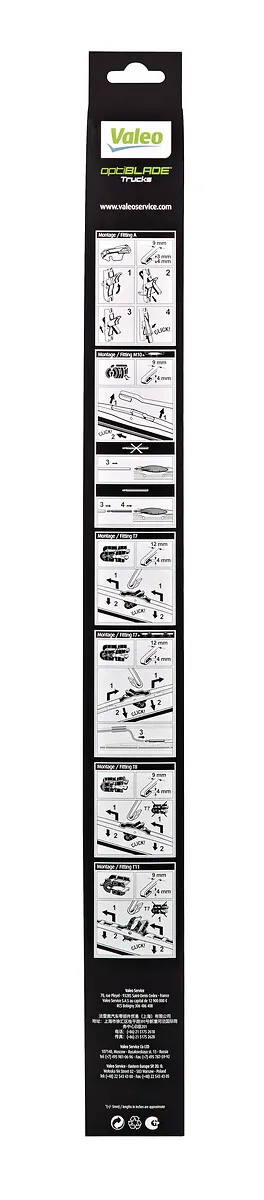 Valeo OptiBlade - серия стеклоочистителей для коммерческого транспорта. Щетки серии имеют крепление Крючок разных размеров, некоторые щетки оснащены форсунками стеклоомывателя. Дворники OptiBlade имеют 100% стальной каркас и износостойкое покрытие резинового элемента.