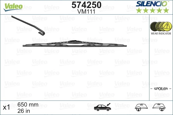 Щетка стеклоочистителя Valeo Silencio Performance Spoiler VM111 предназначена для всесезонного использования. Она оснащена водительским спойлером и имеет длину 650 мм, что обеспечивает плотный контакт со стеклом и эффективное очищение при любой погоде. Каркасная конструкция щетки обеспечивает долговечность и надежность, а наличие индикатора износа позволяет вовремя менять щетку, сохраняя высокое качество очистки. Щетка производится во Франции и поставляется по одной штуке в упаковке, что удобно для замены.