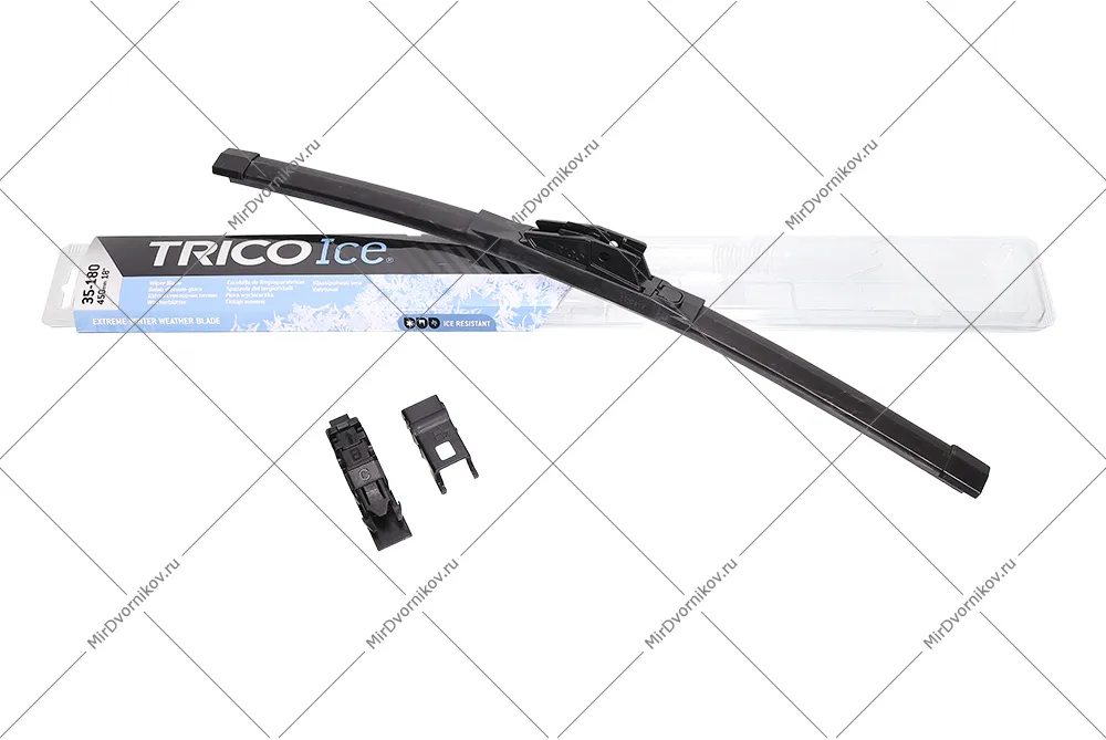 Щетки стеклоочистителя Trico ICE обладают усиленной конструкцией и более толстой резинкой. Эти щетки сочетают плюсы специальных зимних щеток в резиновом чехле и бескаркасных дворников. Еще один плюс серии ICE - сменный элемент крепления. Данные щетки подходят почти для всех автомобилей, включая самые современные, модифицированные крепления VW, Audi и BMW.