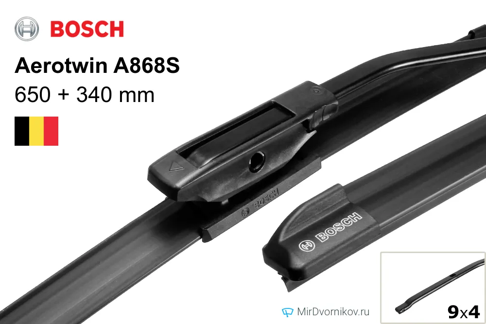 Bosch Aerotwin A868S - набор из 2-х стеклоочистителей с длинами 650мм + 340мм. Дворники имеют бескаркасную конструкцию.