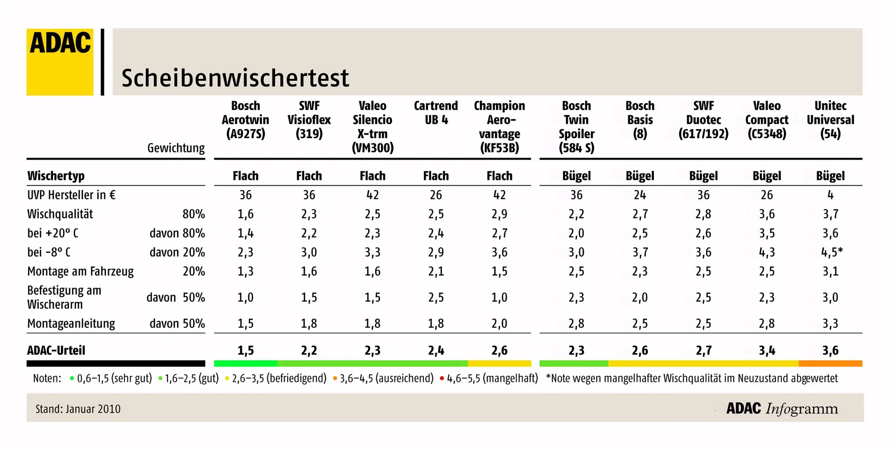 В январе 2010 эксперты ADAC провели сравнительное тестирование щеток стеклоочистителя различных производителей. Выявить лучшие щетки стеклоочистителя получилось после проведения четырех тестов (качество очистки при разных температурах и простота установки) и двум экспертным оценкам. Все результаты тестирования стеклоочистителей были скорректированы на цену комплекта щеток, естественно больше баллов получили более дешевые. Лучшими стеклоочистителями были признаны Bosch Aerotwin, сочетающие отменное качество с приемлемой ценой. Результаты тестирования подтверждают так же отзывы о бескаркасных стеклоочистителях немецких автолюбителей и наших покупателей. Мы приводим перевод их отчета: